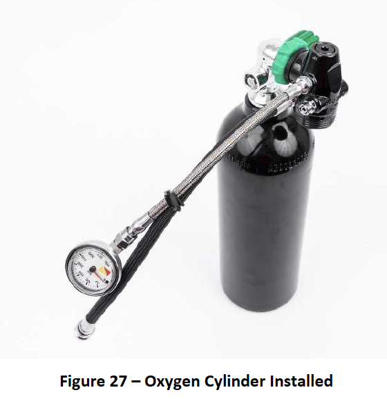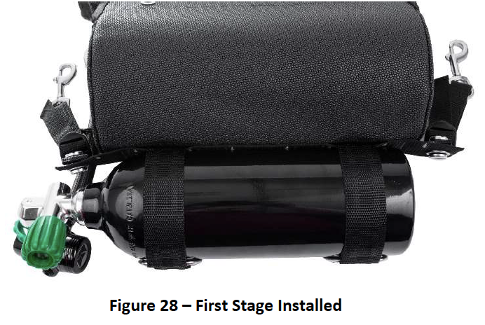 Clip the scrubber canister cover clips together and tighten the straps to snug the cover around the scrubber. The cylinder can now be mounted to the bottom of the cover using the two cam straps. Orient the cylinder with the first stage to the diver’s right and facing up as shown in Figure 28.