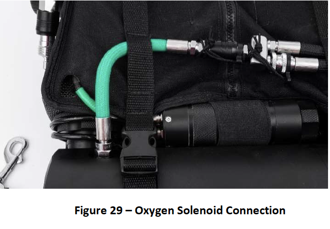 Route the black BC hose through the daisy chain and connect it to the oxygen MAV. Then thread the hose from the first stage through the daisy chain, connect it to the “y” block, and install the lock clip as shown in Figure 30. Ensure that the second black hose is plugged into the Oxygen Manual Add Valve